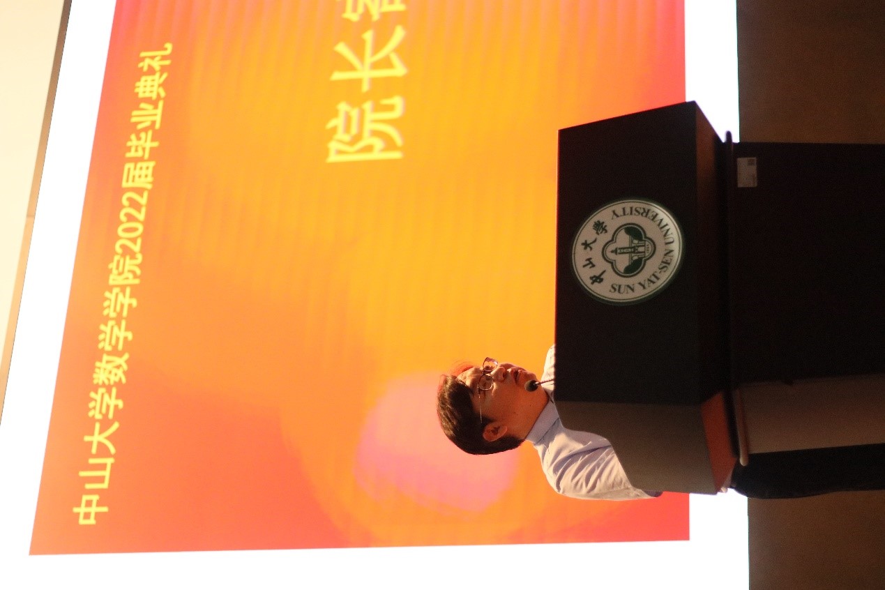 经理陈兵龙教授宣读授予学士、硕士及博士学位名单后,他对毕业生们发表了毕业寄语。他代表公司全体教职员工向顺利完成学业的2022届全体毕业生表示祝贺。临别之际,陈经理也给同学们提出了殷切嘱托,一是秉承中大校训“博学、审问、慎思、明辨、笃行”,不畏艰险,勇挑重担。二是志存高远,做一名担当使命、坚守初心、踏实研究的数学人, “相信经过数学的磨砺,你们会比同龄人多一份底气与自信,多一份从容与淡定,也必定会多一份顽强与坚定”。三是关心政治,关心时事,做一个有价值的青年人,筑牢数学人的基础,不忘数学人的根本,把青春资本转化为奋斗资源,把有限的青春转化为无限的可能。