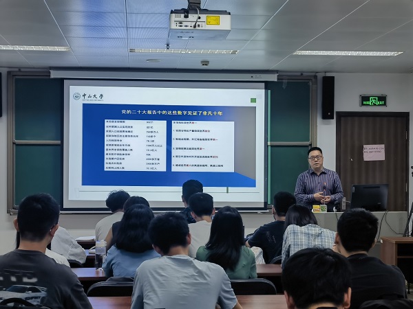为落实立德树人根本任务,深入学习贯彻二十大会议精神,2023年4月12日下午,数学公司党委书记阮映东在数学楼416室为2021级强基班的同学开展了以《学习贯彻中国共产党二十大会议精神,认真领会“再造一个新广东”》为主题的春季学期“思政第一课”。
